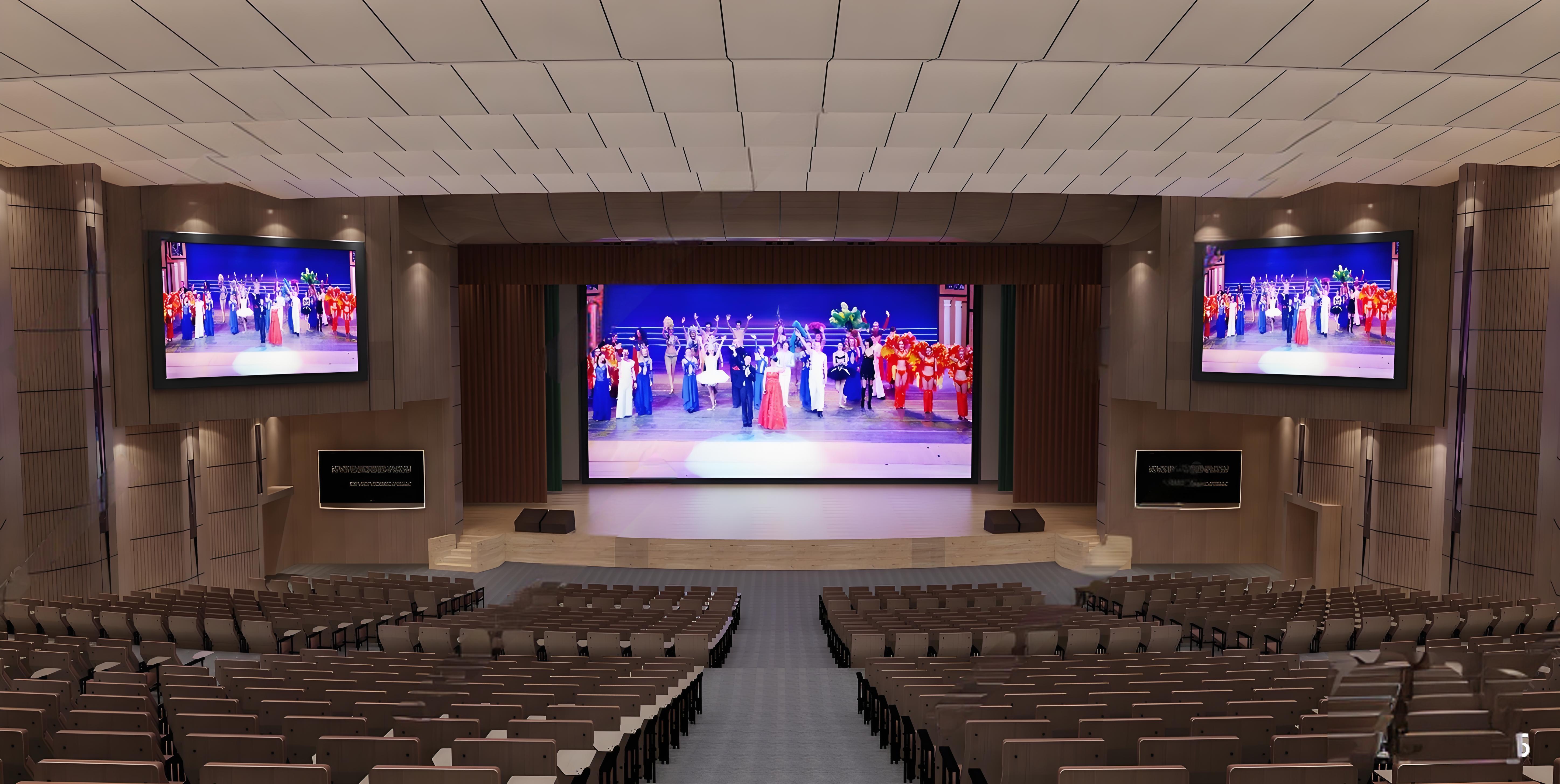 多功能报告厅通常配备大屏幕投影设备、音响系统、照明