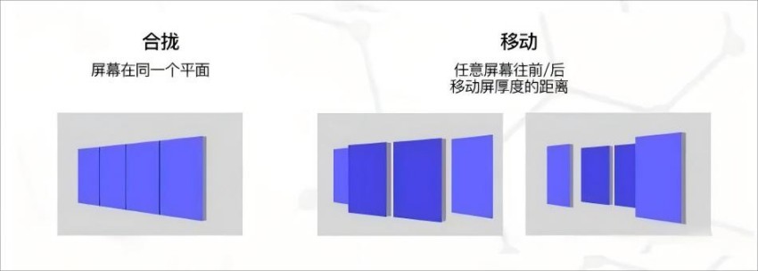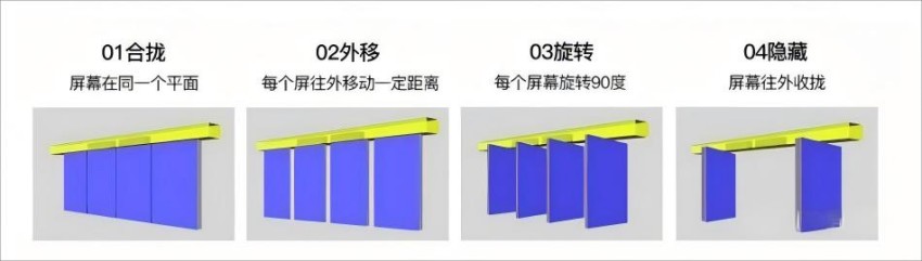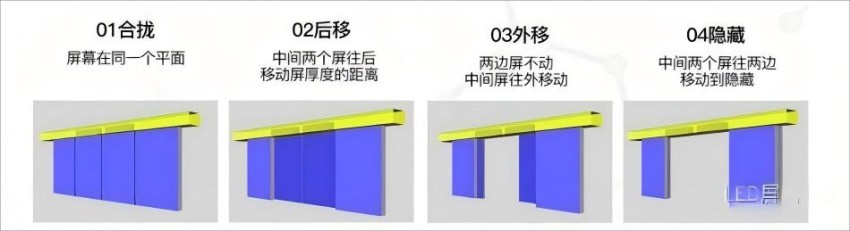 滑轨开合多屏互动屏常见的运动方式如下图展示: