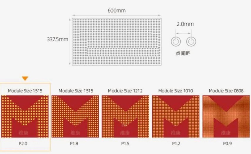 这里就要引入两个概念,一个是LED显示屏的长度与高度的尺寸,一个是LED屏的点间距。尺寸就是指LED屏的长度和高度,测量单位为豪米(mm)。点间距是指的是LED显示屏中,一个灯珠中心到相邻灯珠中心的距离,单位为毫米(mm),常用字母P来简称点间距,目前市场上的型号从P0.9到P20不等。P值越小,即点间距越小,屏幕的清晰度就越高。例如P2,那么该LED显示屏的点间距数值就为2mm。以一个长4米,高2米,用R2间距的LED大屏幕举例来说,它的分辨率就(4000mm/2mm)*(2000mm/2mm),得出它的整体分辨率就是2000*1000像素。