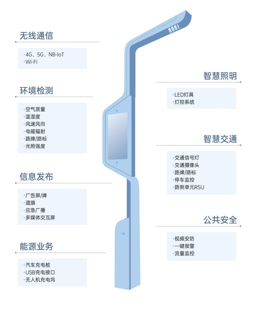 智慧灯杆是以灯杆为主体串联各种物联网设备,经过统一管控和数据融通,形成智慧城市信息节点,同时衔接各类智慧应用,构建智慧城市民生服务综合窗口。(图片来源:中国智慧杆塔白皮书)