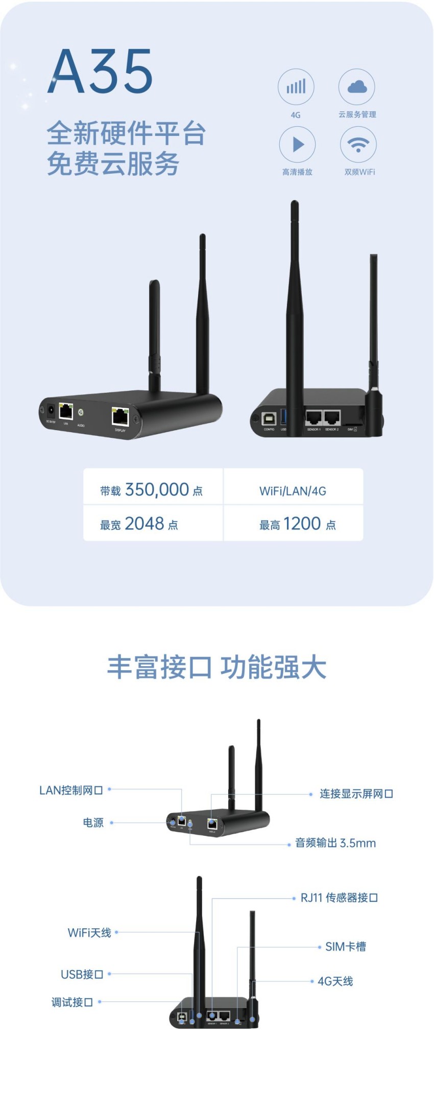 LED灯杆屏作为其中信息发布的重要载体,集广告牌,道路指引,应急广播,媒体互动等功能于一身,为相应5G时代的号召,和建设新型智慧城市的需求,A35云联网播放盒,专为智慧灯杆而生。
