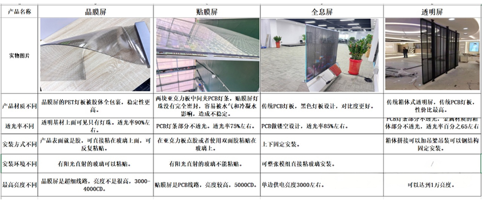 二、晶膜屏、贴膜屏、全息屏与透明屏实物及产品性能特点对比,如下表:
