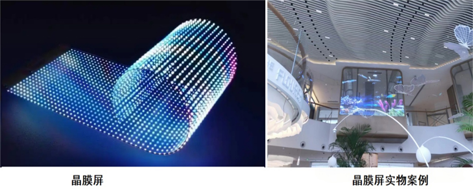LED晶膜屏,也称果冻屏。采用LED灯珠裸晶植球技术,灯板采用透明晶膜胶片,表面蚀刻透明网状电路,表面贴完元器件后真空封胶工艺,从而呈现柔性透明的显示效果。